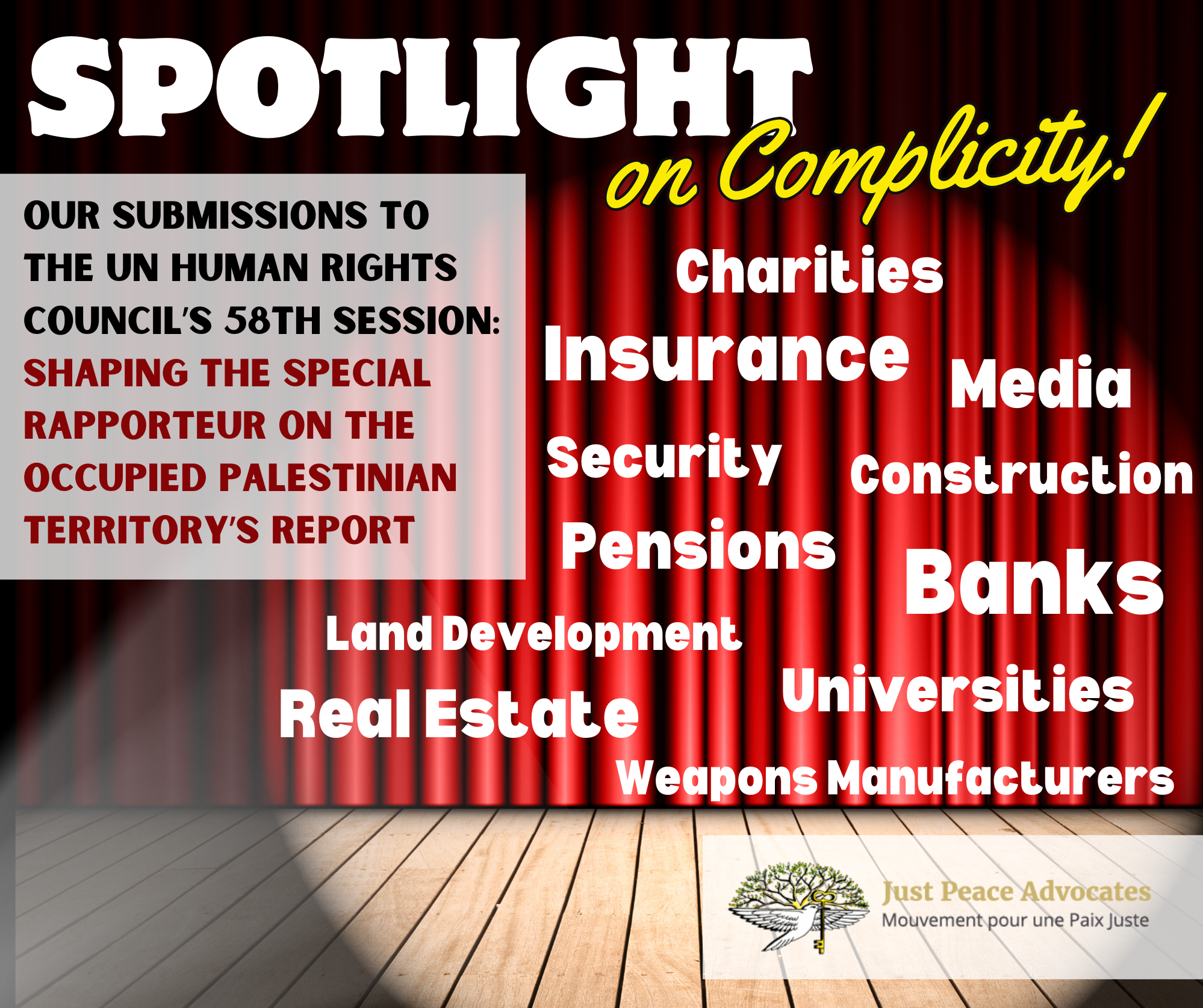 In November 2024, Just Peace Advocates answered the call for input for the report of the Special Rapporteur on the occupied Palestinian territory to the Human Rights Council 58th session, with a dozen submissions. These included various sectors including financial institutions, insurance companies, pensions, charities, media, military and security companies, other businesses such as EPCOR, media, universities and others.