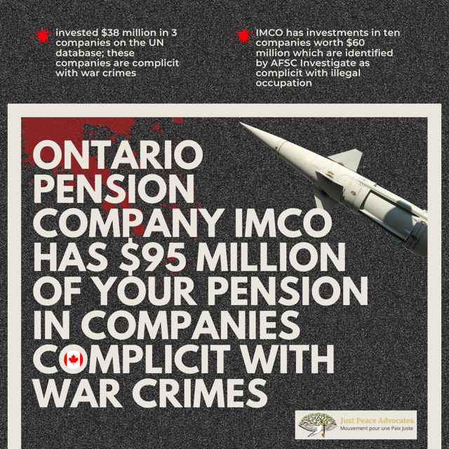 We ask the IMCO to take all steps necessary to ensure that the activities of all companies included in all of its portfolio are in compliance with international law governing war crimes. We remind you that in Canada, parties that are complicit in war crimes are liable to criminal prosecution under the Crimes Against Humanity and War Crimes Act,[1] including corporations.[2]