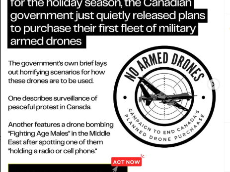 After Parliament adjourned for the holiday season, the Canadian government just quietly released plans to purchase their first fleet of military armed drones for both domestic surveillance and attacks overseas. They’re hoping we won’t notice their sneaky announcement.