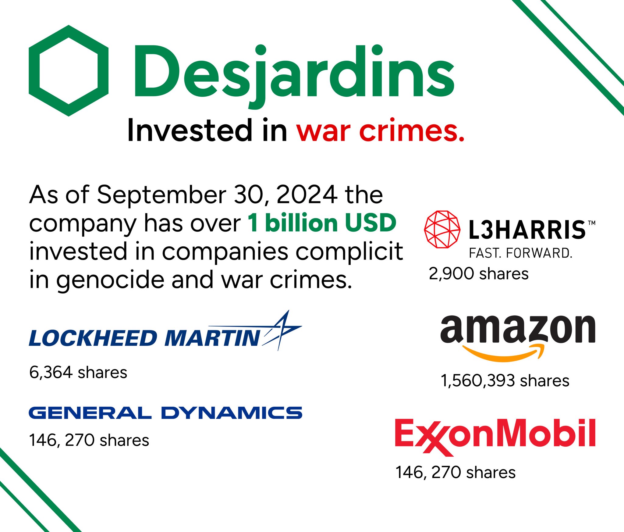 Desjardins (Federation des caisses Desjardins du Quebec) had over $1 Billion USD invested in war crimes and genocide in its Sept. 30, 2024 filing. $31 million in companies on the UN list, and the remainder in companies listed by AFSC Investigate.