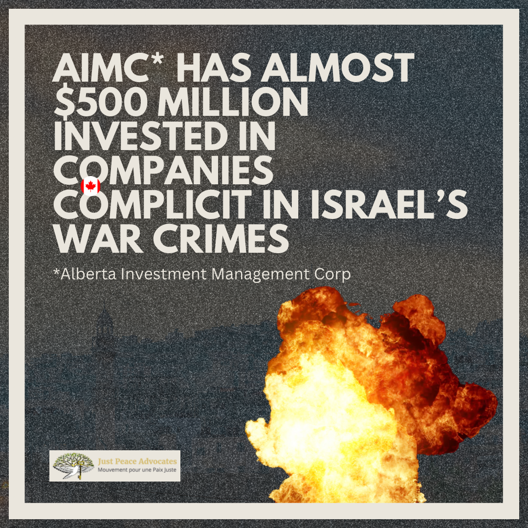 In April 2024, we wrote to the Alberta Investment Management Corp. to ask them about their about half a billion USD direct investments in companies complicit with war crimes and potentially genocide. No response has been received.