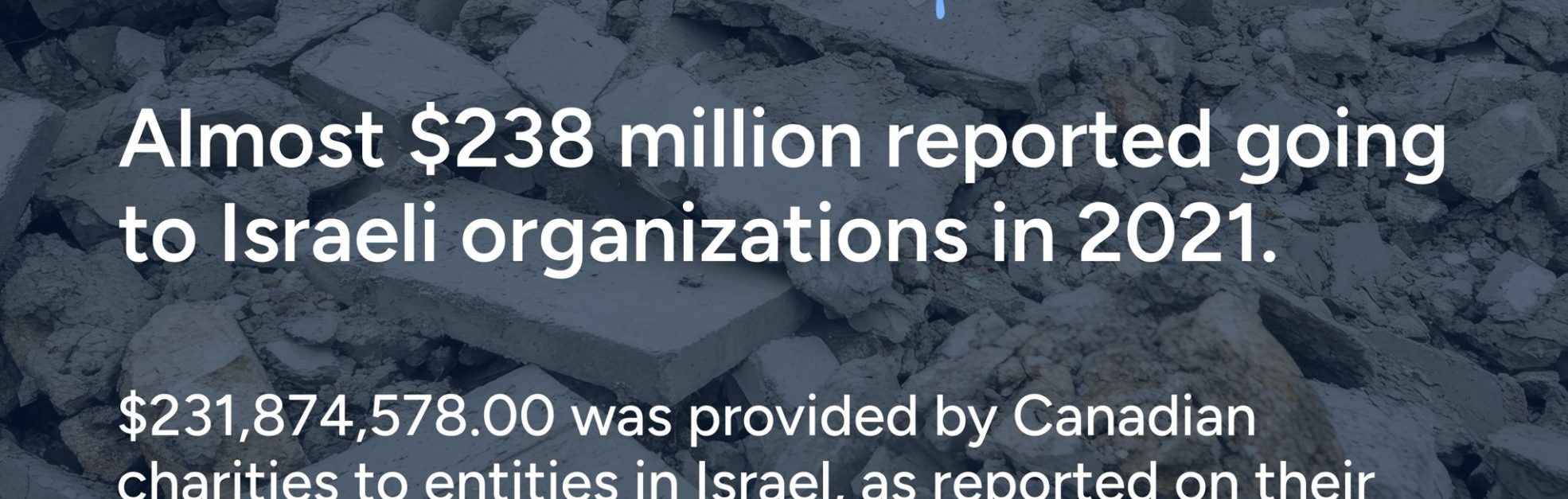 n 2021, $231,874,578.00 was provided by Canadian charities to entities in Israel, as reported on their Schedule 2/T1030. This does not include funds being sent to universities in Israel who are consider “qualified donors” on T1236, or funds going to Scholarships (line 4910) or operations in Israel like office and staff costs. This is just the transfers to supposedly qualified entities in Israel.