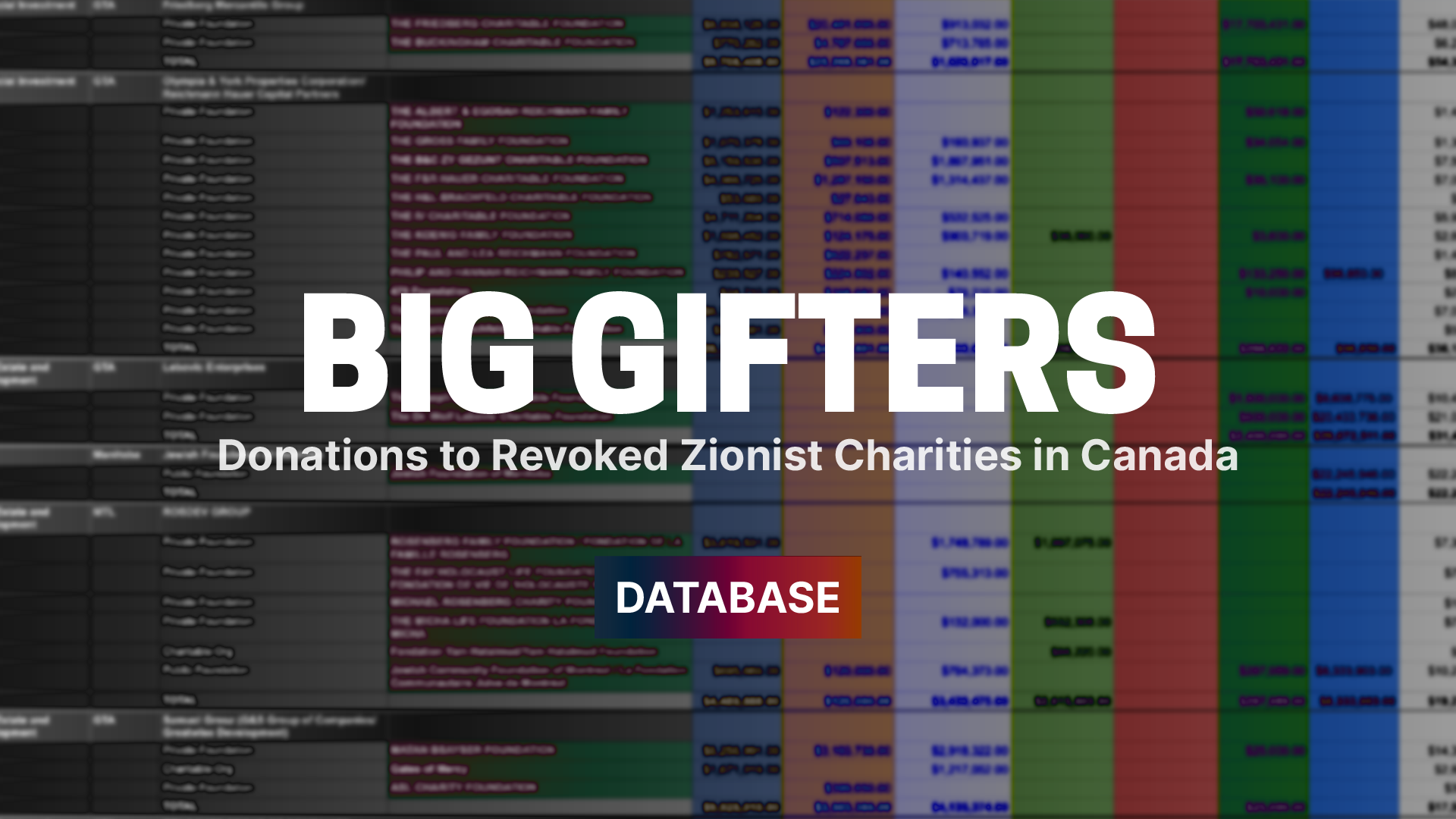 All donors identified in the Big Gifters table provided at least $1 million CDN, cumulatively, to the seven revoked charities. Donors were aggregated, where applicable, based upon shared boards of directors or kinship ties.