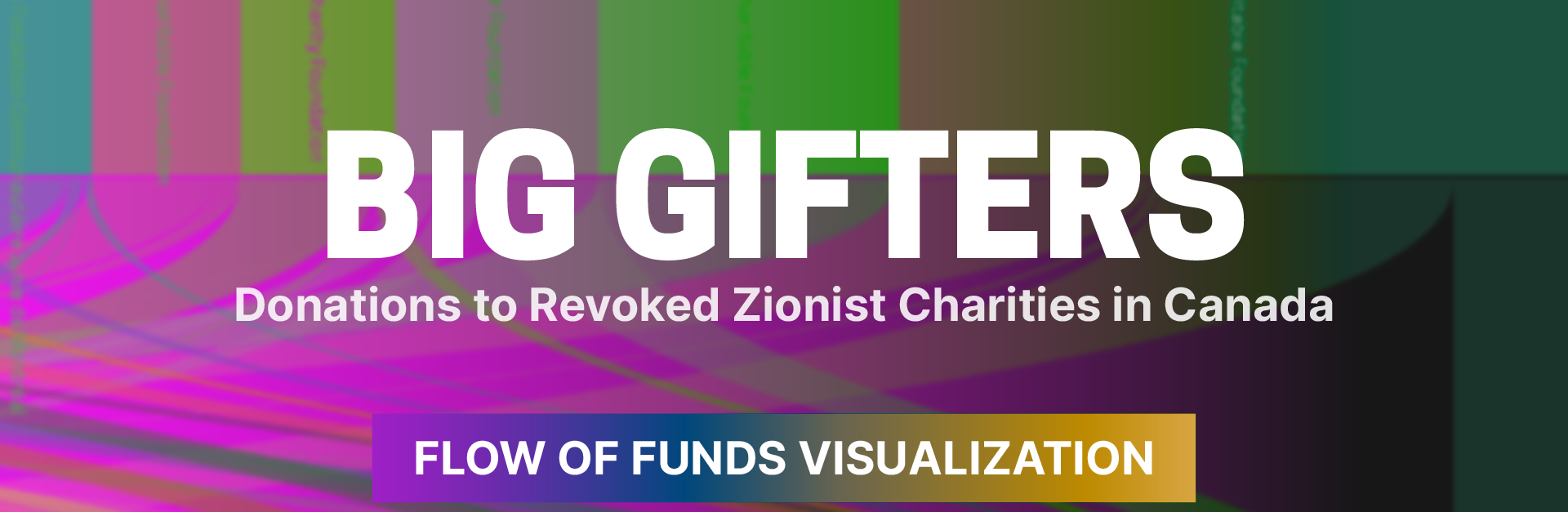 The Big Gifters flow diagram tallies charitable donations to seven revoked Canadian charities, between 2000-2023, by other Canadian charities. The seven revoked charities were selected based upon their self-disclosure of having moved at least $ 1 million CDN in charitable donations from Canada to Israel, between 2018-2023. All donors identified in the Big Gifters table … Continue reading The Big Gifters List, Flow Diagram
