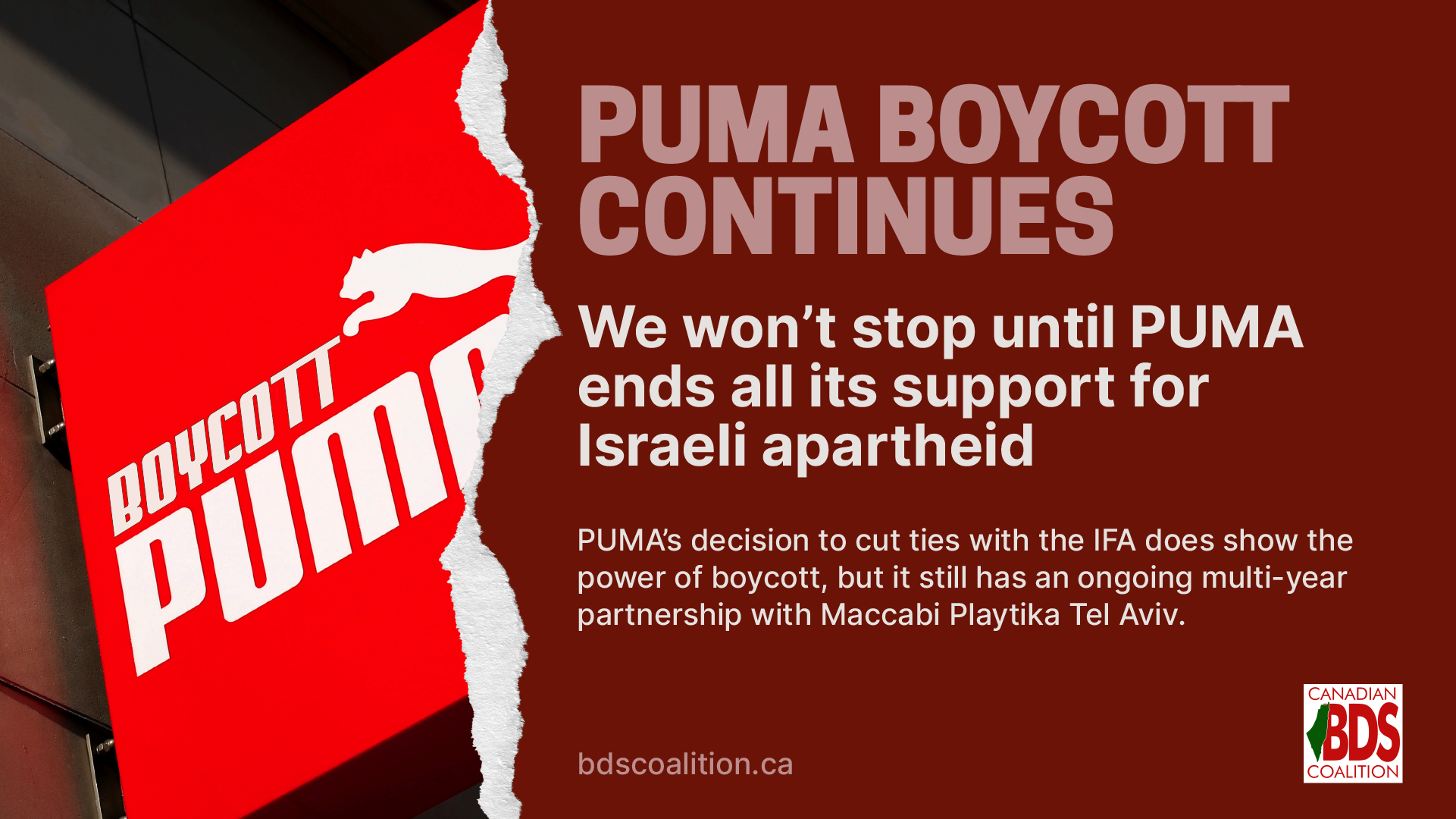 PUMA has announced it will end its sponsorship of Israel’s national soccer league (the IFA) in 2024. PUMA’s announcement comes in the midst of Israel’s genocidal violence in Gaza and it follows years of international pressure against PUMA for its sponsorship of the IFA. This includes many actions across Canada over the years, along with thousands of letters.