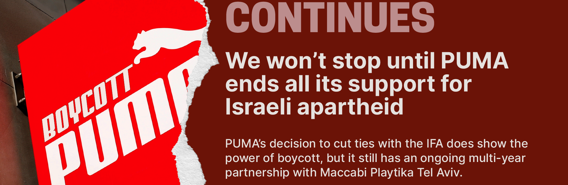 The Canadian BDS Coalition has pointed out that PUMA signed a multi-year partnership in August 2021 with Maccabi worth millions of dollars. The Maccabi Playtika Tel Aviv play with Puma uniforms and exact copies of the uniforms are available for purchase in the club’s stores.The Canadian BDS Coalition has indicated that their support for boycotting Puma would continue as long as this and any other apartheid agreements are in place.
