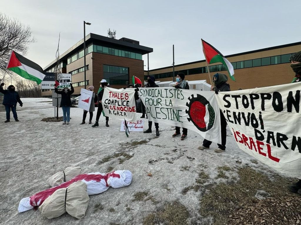 Communities are taking action to demand an end to military exports to Israel, exactly one month after the International Court of Justice found a plausible case that Israel is committing genocide in Gaza and just days after UN experts called for an immediate arms embargo. Thales is a massive global weapons company that has been involved in Israel’s military supply chain for decades, providing various systems and components for Israel’s air force, navy and ground forces. A dozen members of PalestineQuébec, Labour for Palestine, and Collectif pour la paix picketed outside their facility on the outskirts of Québec City this morning, engaging workers arriving for the morning shift.