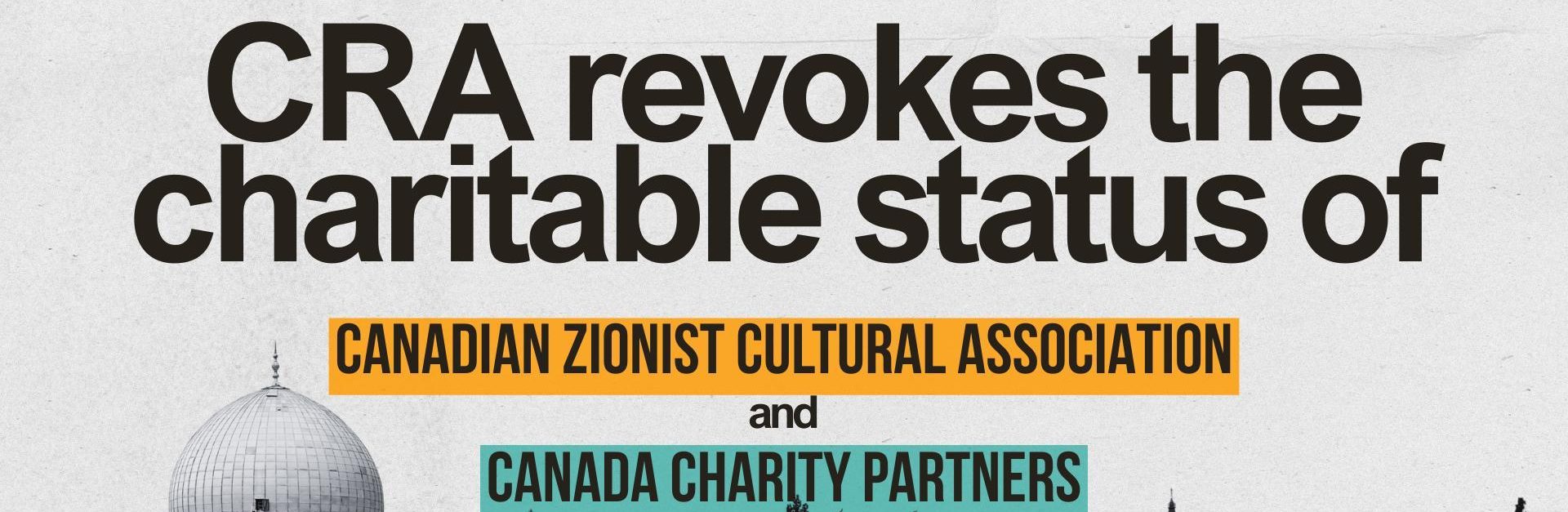 The Canada Gazette has just published that the following Charities have been revoked: Business number Name / Address 108075748RR0001 THE CANADIAN ZIONIST CULTURAL ASSOCIATION, NORTH YORK, ONT. Business number Name / Address 818335390RR0001 CANADA CHARITY PARTNERS, CÔTE-SAINT-LUC, QUE. Requests to the CRA to investigate the Canadian Zionist Cultural Association (CZCA) were first made in 2021. … Continue reading Breaking News: CRA revokes charitable status of Canadian Zionist Cultural Association and Canada Charity Partners