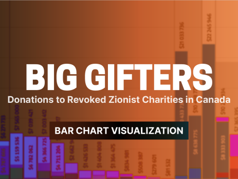 The Big Gifters bar graph tallies charitable donations to seven revoked Canadian charities, between 2000-2023, by other Canadian charities. The seven revoked charities were selected...