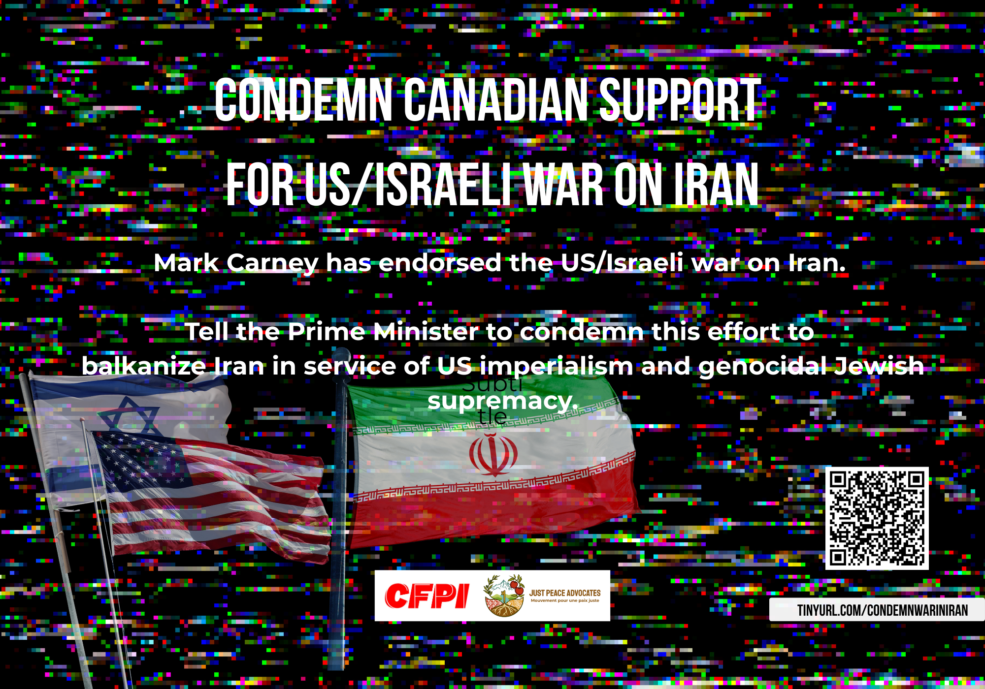 Mark Carney has endorsed the US/Israeli war on Iran. Tell the Prime Minister to condemn this effort to balkanize Iran in service of US imperialism and genocidal Israel supremacy.