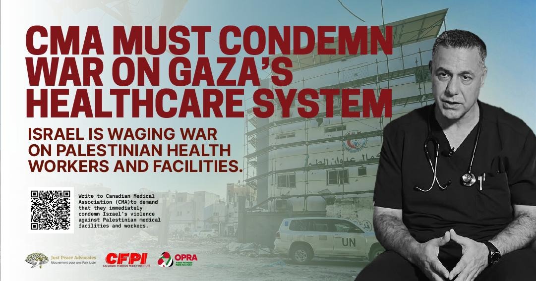 On December 31, 2024 we called the Canadian Medical Association (CMA) must immediately condemn Israel’s violence against Palestinian medical facilities and workers.