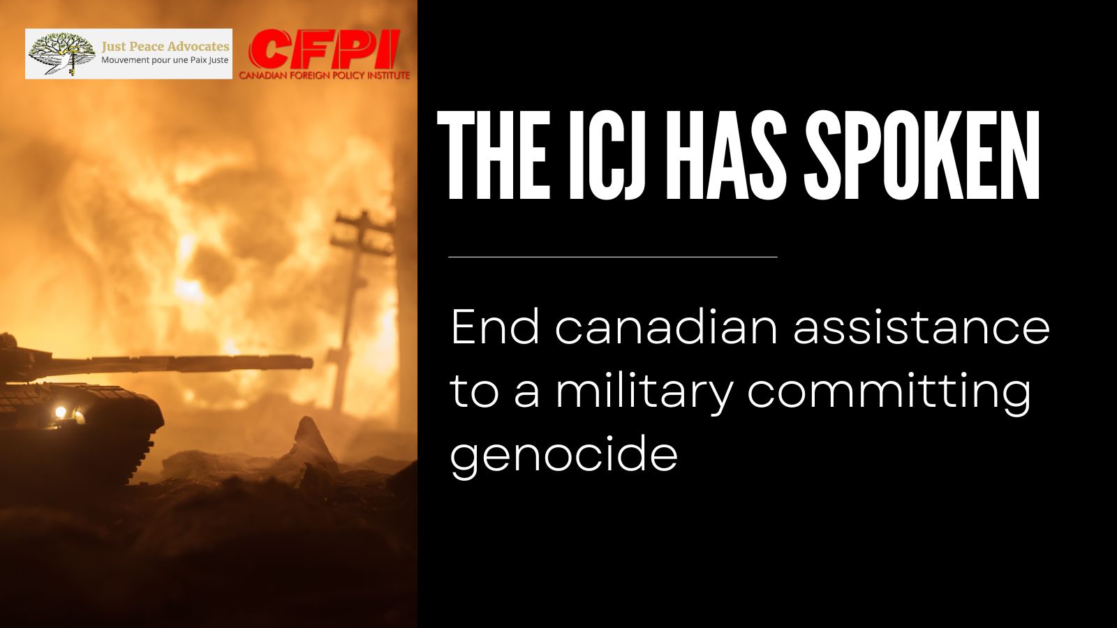 In response to the International Court of Justice finding that Israel may be committing genocide and delivering a provisional ruling that Israel must cease its genocidal policies in Gaza, the Canadian Foreign Policy Institute and Just Peace Advocates are calling on the Trudeau government to ensure Canada is not enabling a genocide by immediately suspending direct Canadian assistance to the Israeli military.