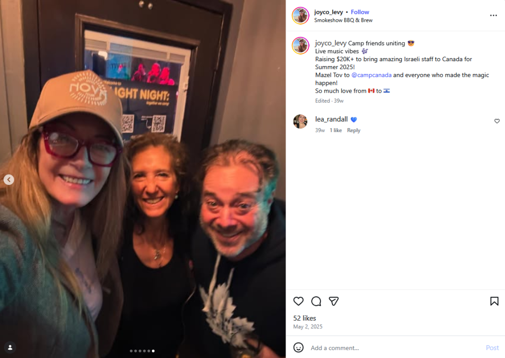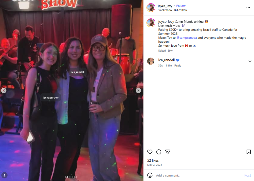 En mai 2025, Levy a également publié un message annonçant qu’elle avait collecté 20 000 dollars pour faire venir du personnel israélien au Canada. Cette initiative aurait été menée en collaboration avec Camp Canada. Levy était présente, tout comme Lea Randall et Jenna Purther, deux autres membres du personnel de l’OCA.