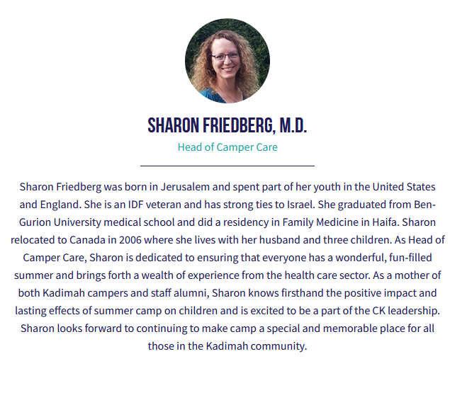 - Sharon Friedberg, responsable des campeurs au Camp Kadimah, est « une vétérane de l’armée israélienne qui entretient des liens étroits avec Israël ».