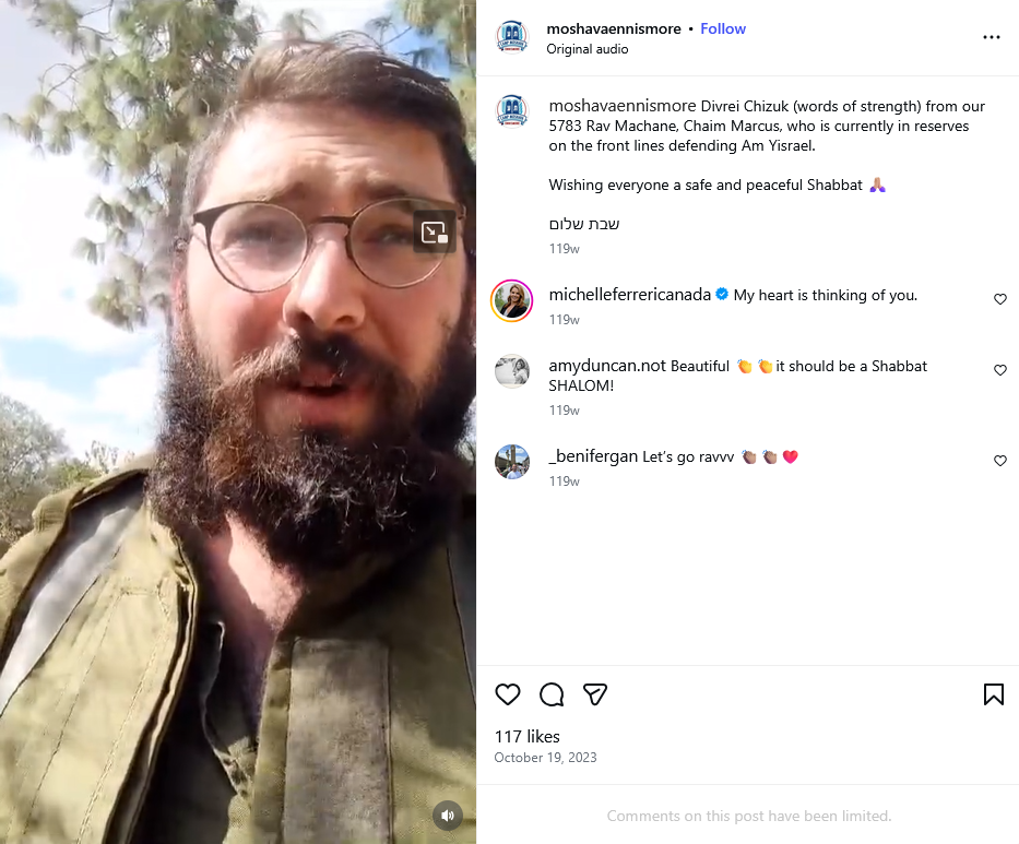 - Le chef cuisinier du camp Moshava Ennismore en 2023 a été « chef cuisinier dans Tsahal pendant 3 ans ». Leur chef cuisinier en 2024, Yehudah Jacobs, est le fondateur de l’organisation à but non lucratif Smiles for the Kids, « qui nourrit chaque semaine les soldats de Tsahal…» Ils ont également engagé des personnes vivant dans des colonies illégales en Cisjordanie occupée, comme Chaim Marcus qui habite à Gush Etzion. Dans ce cas, Marcus était également membre de l’armée israélienne, sur les « lignes de front », en octobre 2023. Le camp Moshava Ennismore a également engagé un « commandant Duvdevan de Tsahal » et son épouse en 2023 pour un « programme spécial ».