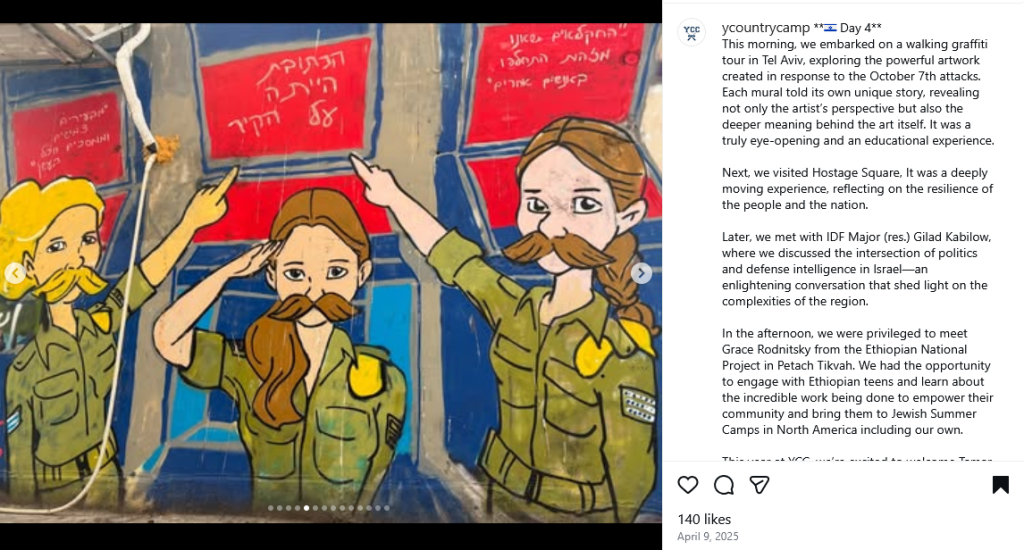 - Le Harry Bronfman Y Country Camp (YCC) commémore Yom HaZikaron, une journée du souvenir dédiée aux soldats israéliens. L’équipe dirigeante du YCC s’est également rendue en Israël en avril 2025. Ils y ont rencontré le « Major (rés.) Gilad Kabilow, de Tsahal » et ont « discuté de l’intersection entre la politique et le renseignement de défense en Israël ».