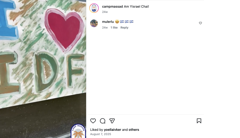 - Quant au Camp Massad Canada, il a publié une vidéo comprenant une affiche sur laquelle on pouvait lire « I ♥️ IDF » (J’aime Tsahal).