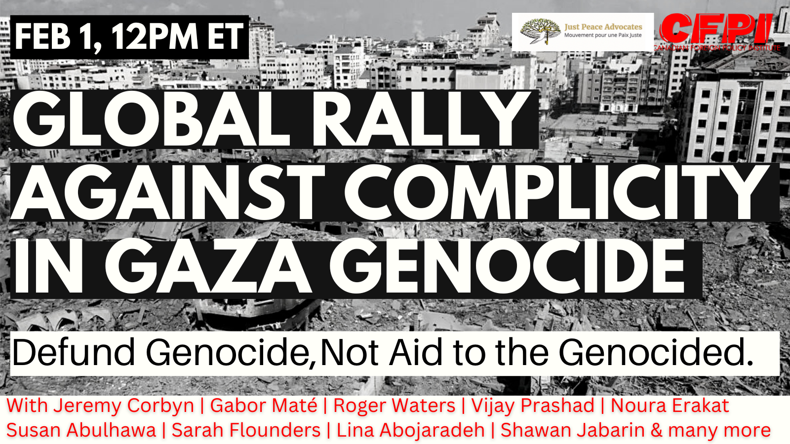 On February 1, Just Peace Advocates co-hosted an online rally against Canada’s complicity in genocide. Join Gabor Maté, Roger Waters, Vijay Prashad, Ronnie Kasrils and many others calling on our governments to “Defund genocide NOT aid to the genocided.”