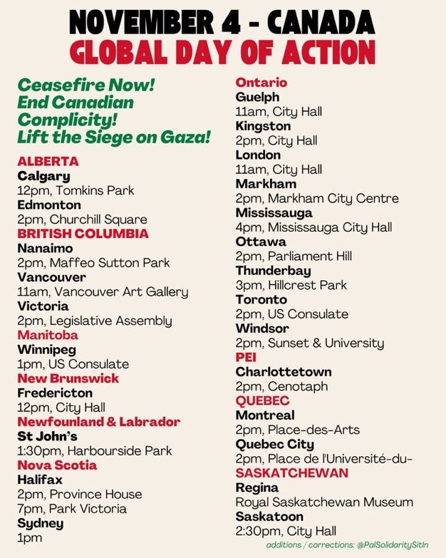 Tomorrow (Saturday Nov 4) the 100K March for Gaza is taking place in at least two dozen cities across Canada. This is expected to be the largest Palestine solidarity mobilization in Canadian history. It’s part of an international day of action expected to see millions take to the streets around the world.