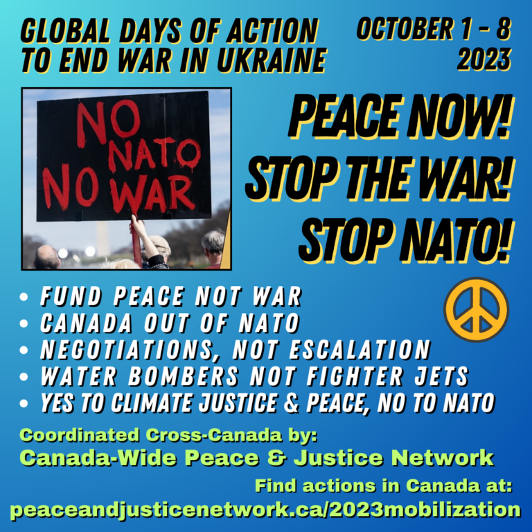 The Canada-Wide Peace & Justice Network, made up of 49 organizations across Canada, is coordinating actions in eleven cities across Canada as part of the Global Week of Action to End War in Ukraine, October 1-8. The Global Week of Action includes protests in 16 countries, and was initiated by the International Peace Bureau and other organizers of the International Summit for Peace in Ukraine, which took place in Vienna in June 2023.