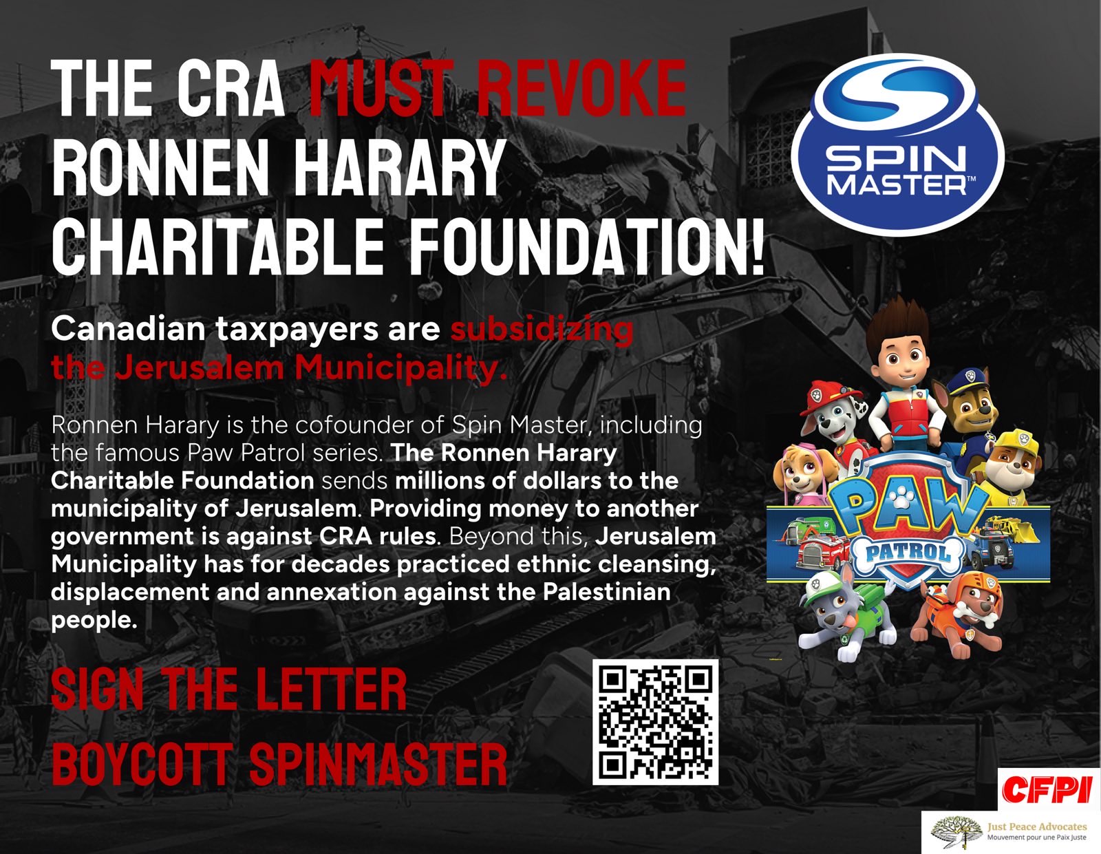 Tell the Canada Revenue Agency they need to suspend the Ronnen Harary Foundation, and audit both this charity and its sister charity, 1 R32 Foundation, which has bragged about feeding the IDF before they headed for the ground invasion in Gaza in fall 2023, and which transfers money to Ronnen Harary Foundation.