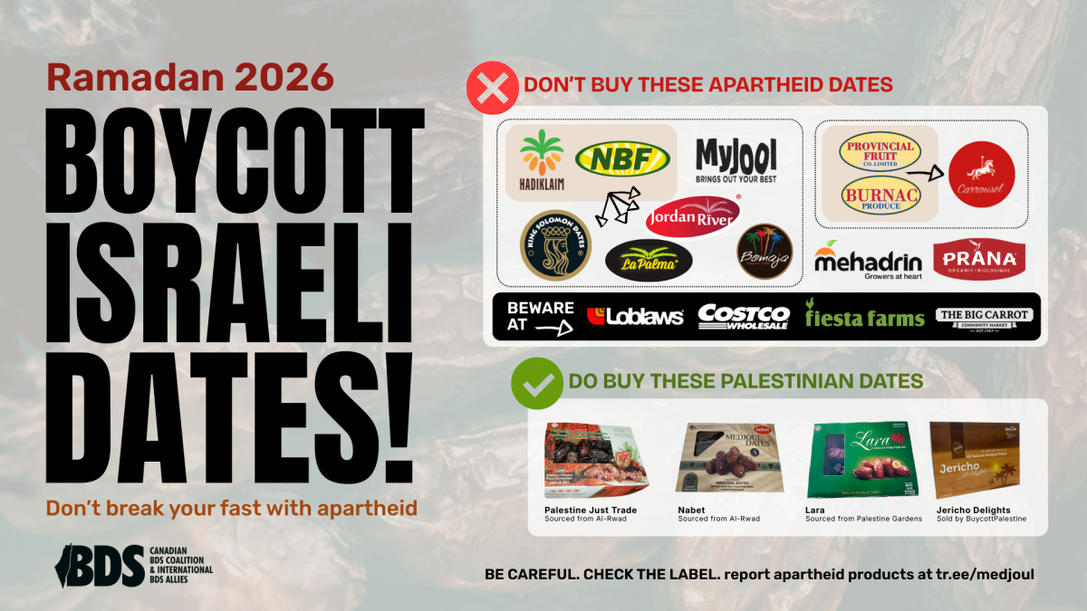 Fruit and vegetables are one of Israel’s biggest exports and all Israeli agricultural exporters are complicit in Israel’s violations of international law as they operate on stolen Palestinian land. An estimated 75% of Medjoul dates are marketed as “Products of Israel” but are grown in illegal Israeli colonial settlements. Don’t break your fast with apartheid!