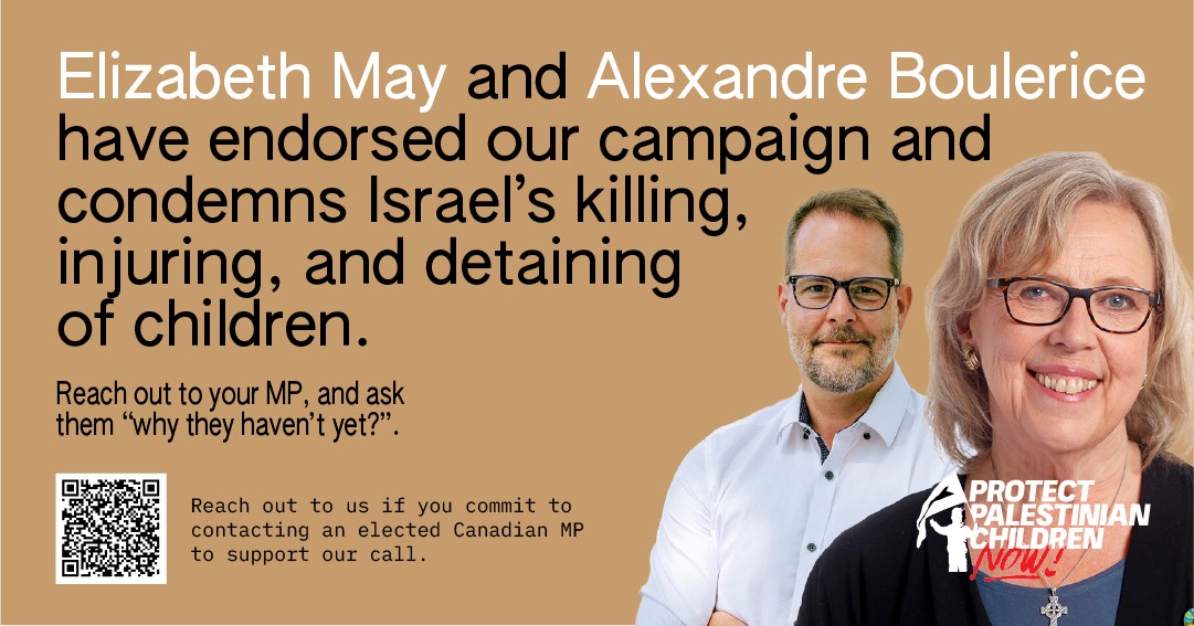 Elizabeth May and Alexandre Boulerice have endorsed our campaign, and condemn Israel’s killing, injuring and detaining Palestinian children.