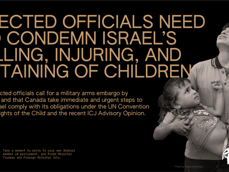 We’re coming together to demand the Canadian government condemn Israel’s killing, injuring, and detaining of children. We support the call for Canada to impose a full, immediate arms embargo on Israel.