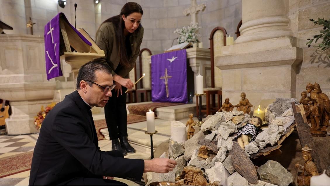 Photo: Pastor Munther Isaac adds dirt to an installation that shows a figure symbolising baby Jesus lying amidst the rubble in a grotto ahead of Christmas at the Evangelical Lutheran Church (Reuters)