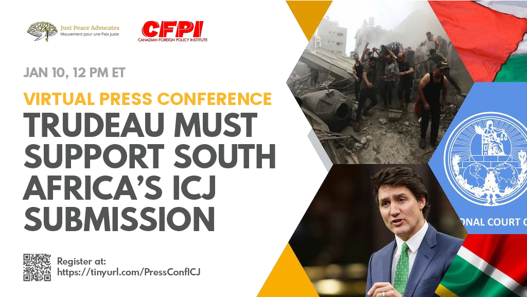 On Wednesday, January 10 at 12 NOON EST, South Africa’s High Commissioner, Palestine’s ambassador, legal experts and others will participate in a press conference to call on Canada to endorse South Africa’s request for the International Court of Justice (ICJ) to make an urgent order declaring Israel in breach of its obligations under the Genocide Convention. At the same time a public letter will be released echoing this demand.