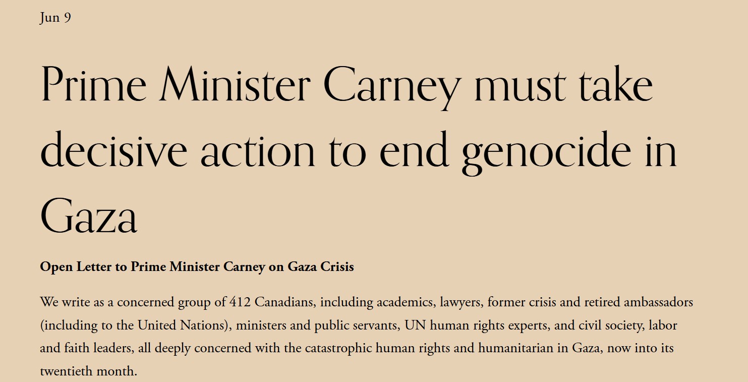 We write this Open Letter to you as a group of 412 professors of law and lawyers with backgrounds in international law and human rights; academics with demonstrated expertise in international relations, justice and human rights; civil society, faith and labor movement leaders; and former and retired ministers, diplomats and public servants who have worked over many decades to advance Canada’s global interests. We write because of the catastrophic human rights and humanitarian crisis in Gaza, now into its twentieth month, which is broadly understood by international law experts and leading human rights organizations as constituting genocide.