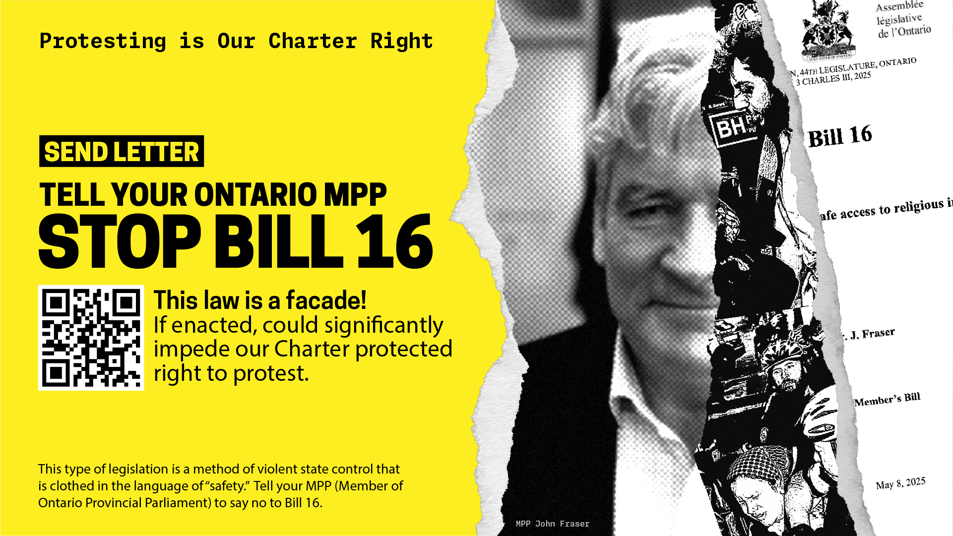 This law is a facade. This type of legislation is a method of violent state control that is clothed in the language of “safety.” Tell your MPP to say no to Bill 16.