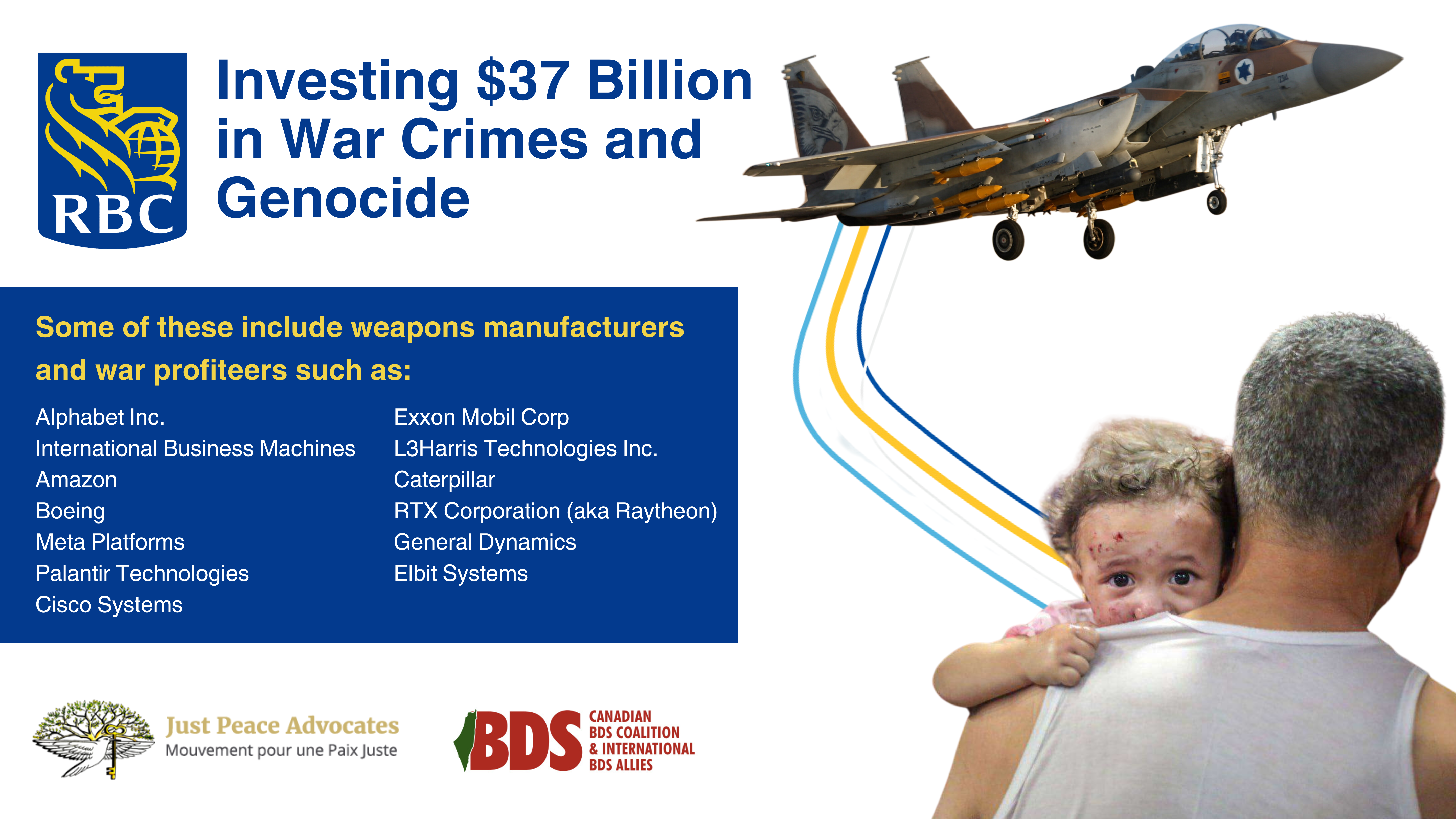 The most recent US SEC filing for Sept 30, 2024, shows RBC investing $37 Billion in war crimes and genocide. This includes $1.8 Billion in companies on the UN list, and almost $36 Billion in companies identified by AFSC Investigate.