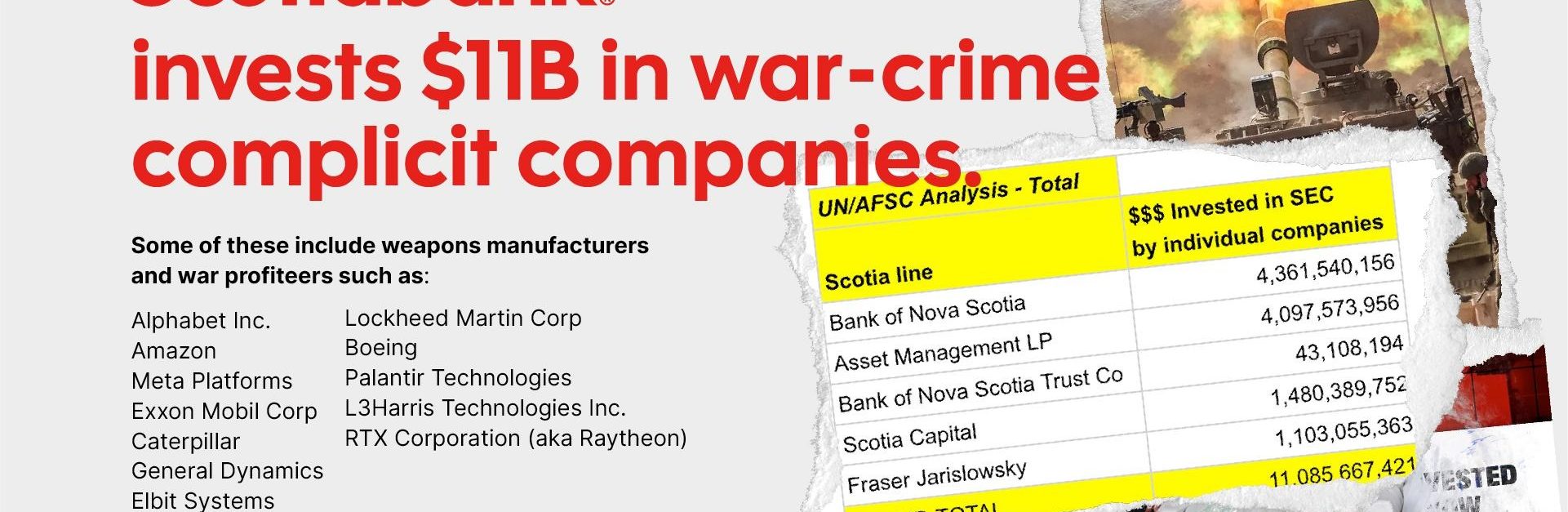 Scotiabank has more than $11 billion USD invested in war crimes, and potentially genocide. This is over $15 billion Canadian invested in war crimes. This includes over $700,000 Canadian in four companies that are listed on the UN database, as well as over $14.3 billion listed by AFSC Investigate. Beyond Elbit, weapons companies such as … Continue reading Scotiabank is invested in over $15 Billion Canadian ($11 billion USD) in war crimes & potentially genocide