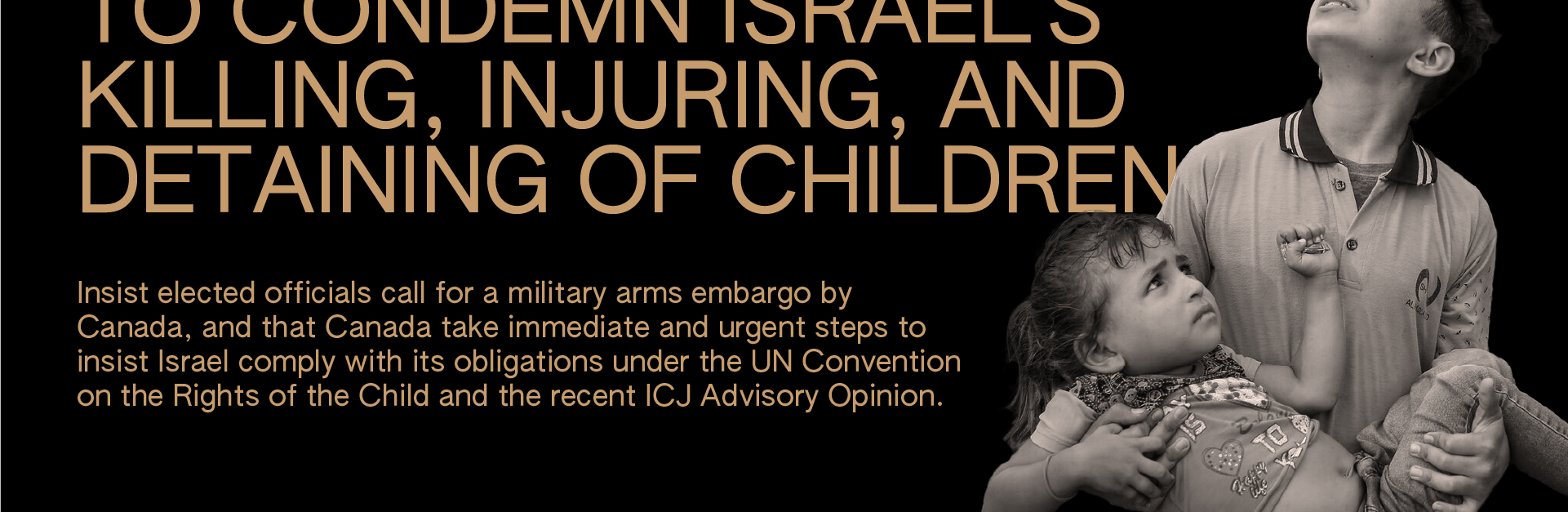 We’re coming together to demand the Canadian government condemn Israel’s killing, injuring, and detaining of children. We support the call for Canada to impose a full, immediate arms embargo on Israel.
