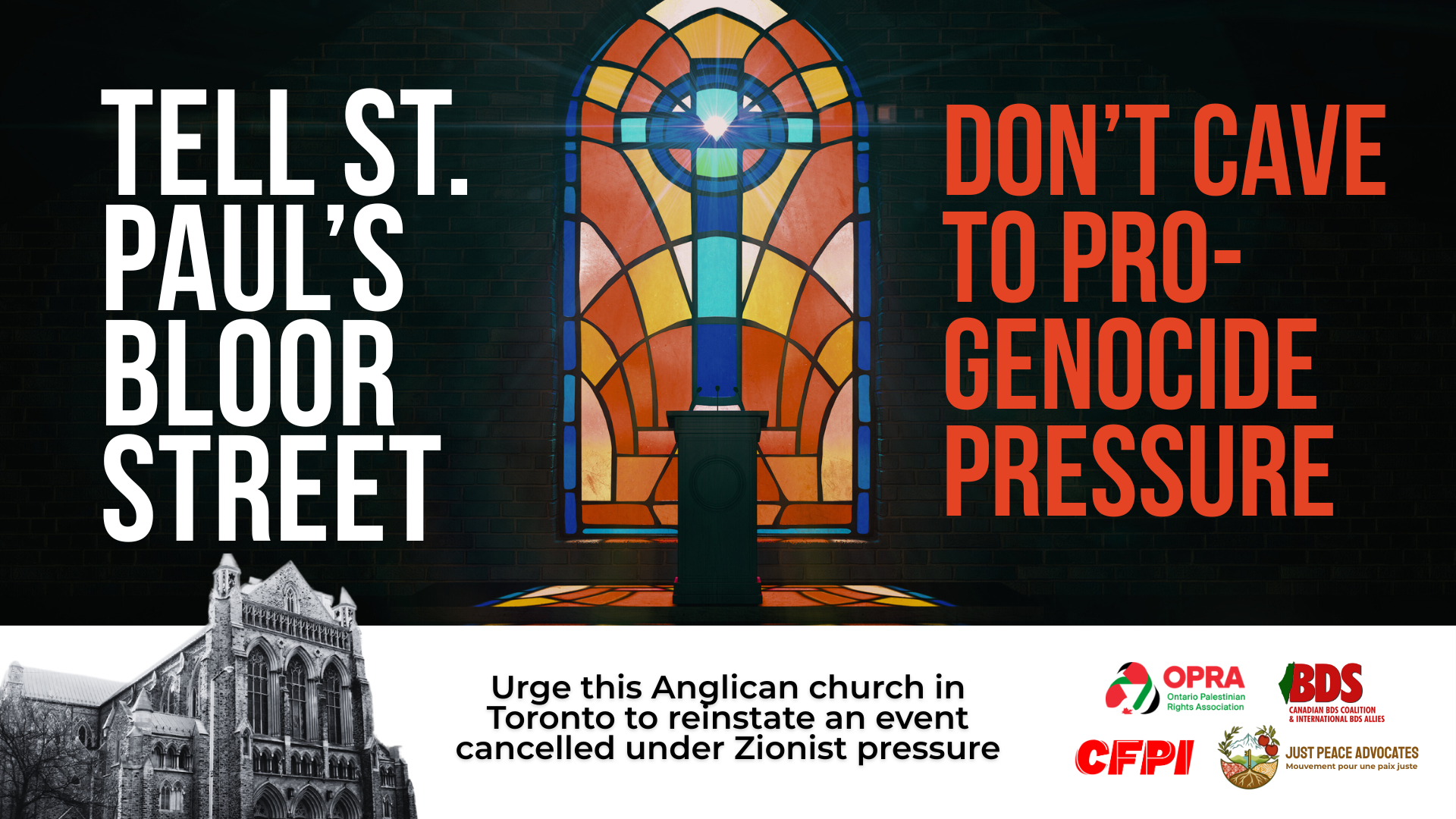 Following pressure from Zionist groups, St. Paul’s Bloor Street Anglican has cancelled a scheduled NDP leadership campaign event in Toronto featuring Yves Engler, Rabbi David Mivasair, University of Toronto student organizer Sara Rasikh, and former Canadian Union of Postal Workers President Mike Palecek. Disturbingly, news of the cancellation was first shared with an extremist anti-Palestinian group before being communicated to the event organizers.