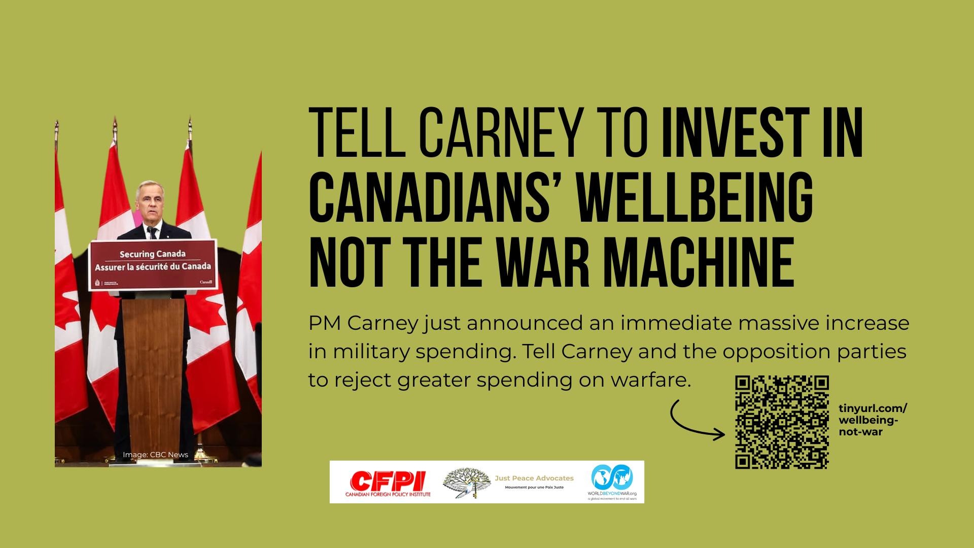 Mark Carney just announced an immediate massive increase in military spending. Please take a minute to tell Carney and the opposition parties to reject greater spending on warfare.