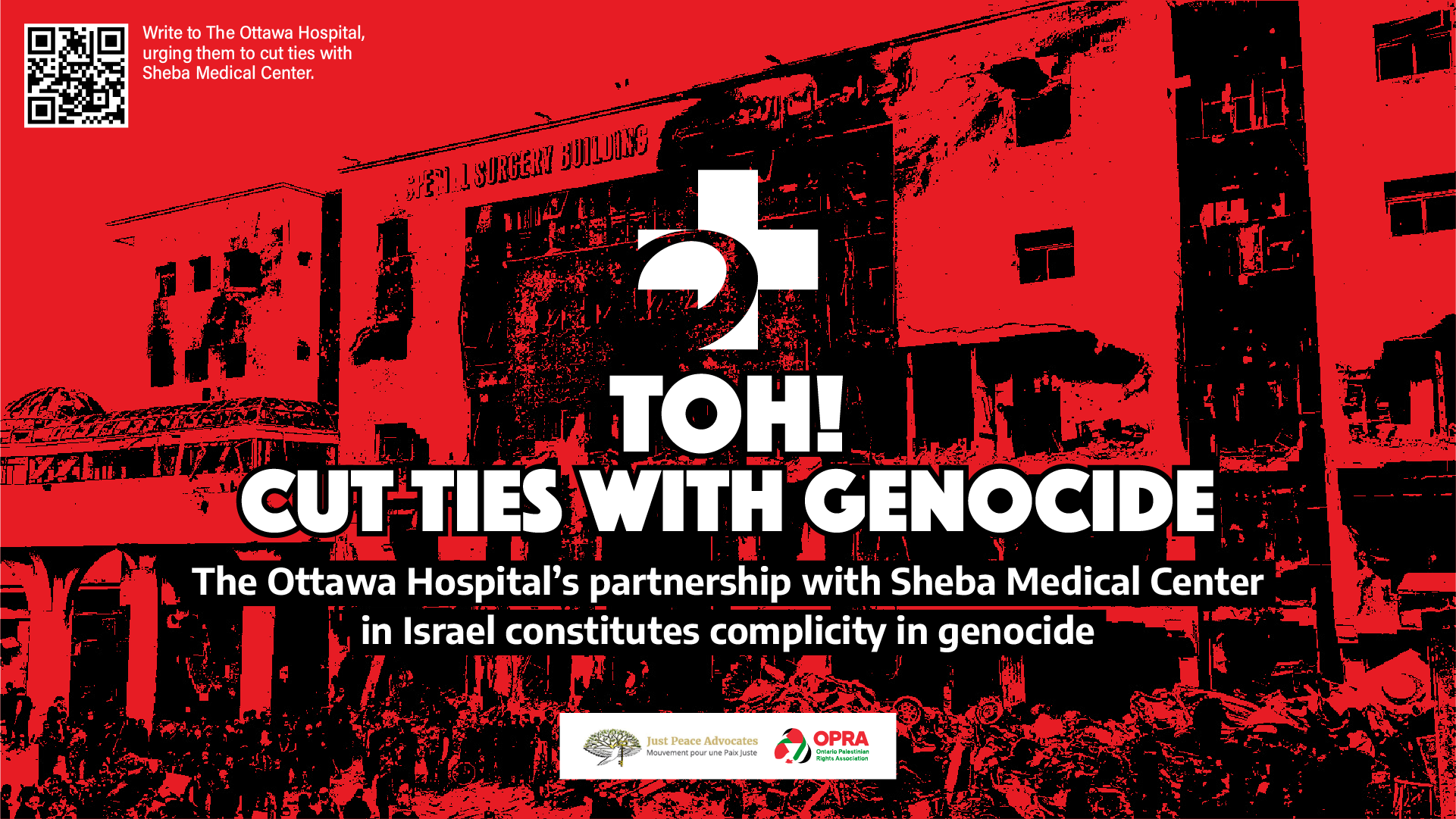 Let The Ottawa Hospital (TOH) leadership know that TOH partnership with Israel’s largest state hospital, Sheba Medical Center, constitutes complicity in the ongoing genocide of Palestinians.