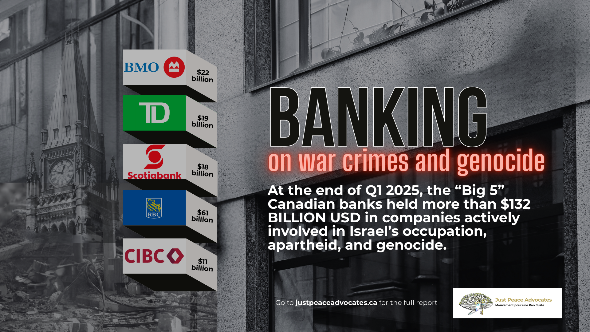In a detailed analysis of the “Big 5” Canadian banks Quarter 1 (Q1) SEC filings, we identified more than $132 BILLION USD of investments in 66 companies implicated in illegal activities in the Occupied Palestinian Territory (oPt). This is the equivalent of approximately $183 billion CAD.