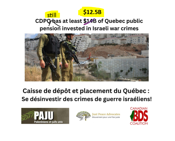 The 2022-year end report of the Caisse de dépôt et placement du Québec (CDPQ) indicated at least $14B investment (actually estimated to be $20B) in over 90 companies complicit with Israeli war crimes. However, a recent selling of shares by one of the companies, Allied Universal, would mean $12.5B of CDPQ funds would remain in companies supporting Israeli occupation of Palestine.