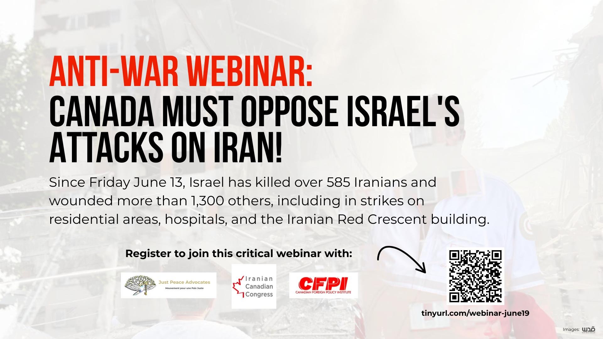 Tomorrow night Just Peace Advocates will be co-hosting “Anti-war webinar: Canada Must Oppose Israel’s Attacks on Iran!” Register for the event with international human rights lawyer Craig Mokhiber, Iranian Canadian Congress president Mona Ghassemi and university lecturer Nasim Noroozi as well as author Yves Engler and lawyer Dimitri Lascaris.