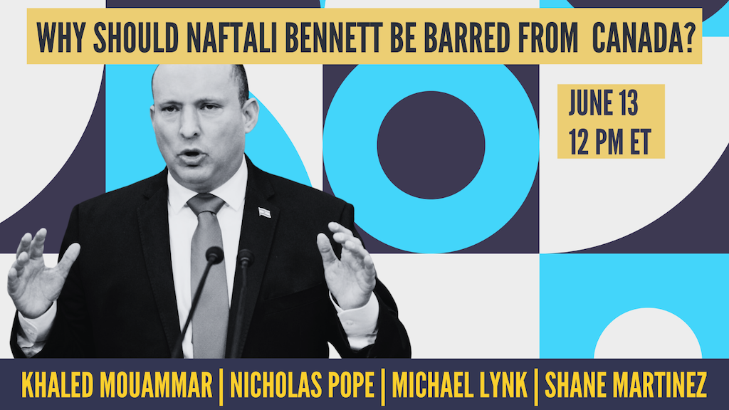 Le 29 mai, des avocats ont déposé une demande au nom d’un Palestinien-Canadien, et de 3 organisations canadiennes demandant au gouvernement fédéral de déclarer l’ancien Premier ministre israélien Naftali Bennett inadmissible au Canada avant qu’il ne prenne la parole à Toronto le 14 juin. La demande soutenait que Bennett devrait se voir refuser l’entrée au Canada en vertu des articles 35(1)(a) et (b) de la Loi sur l’immigration et la protection des réfugiés.